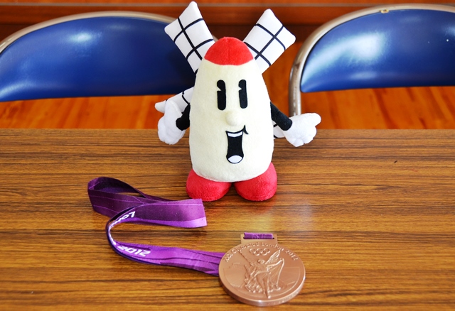 水泳教室終了後は、記念撮影やサイン会が行われ、ロンドンオリンピックで獲得した銅メダルを子供たちの首にかけ、一緒に写真を撮りました。