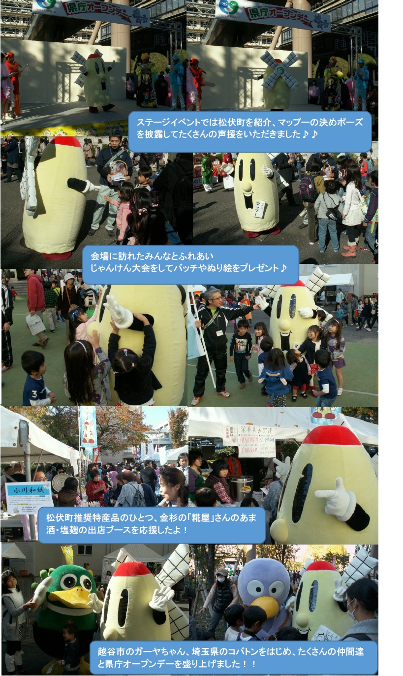 当日は、ステージイベントで松伏町とマップーをPRし、他のゆる玉応援団とともに県庁オープンデーを盛り上げました!