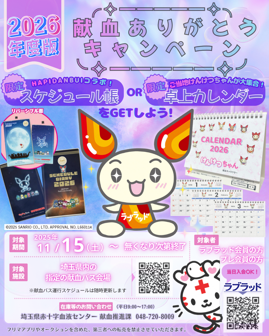 キャンペーン(2) 献血にご協力いただいたラブラッド会員またはプレ会員の方にスケジュール帳または卓上カレンダーをプレゼント