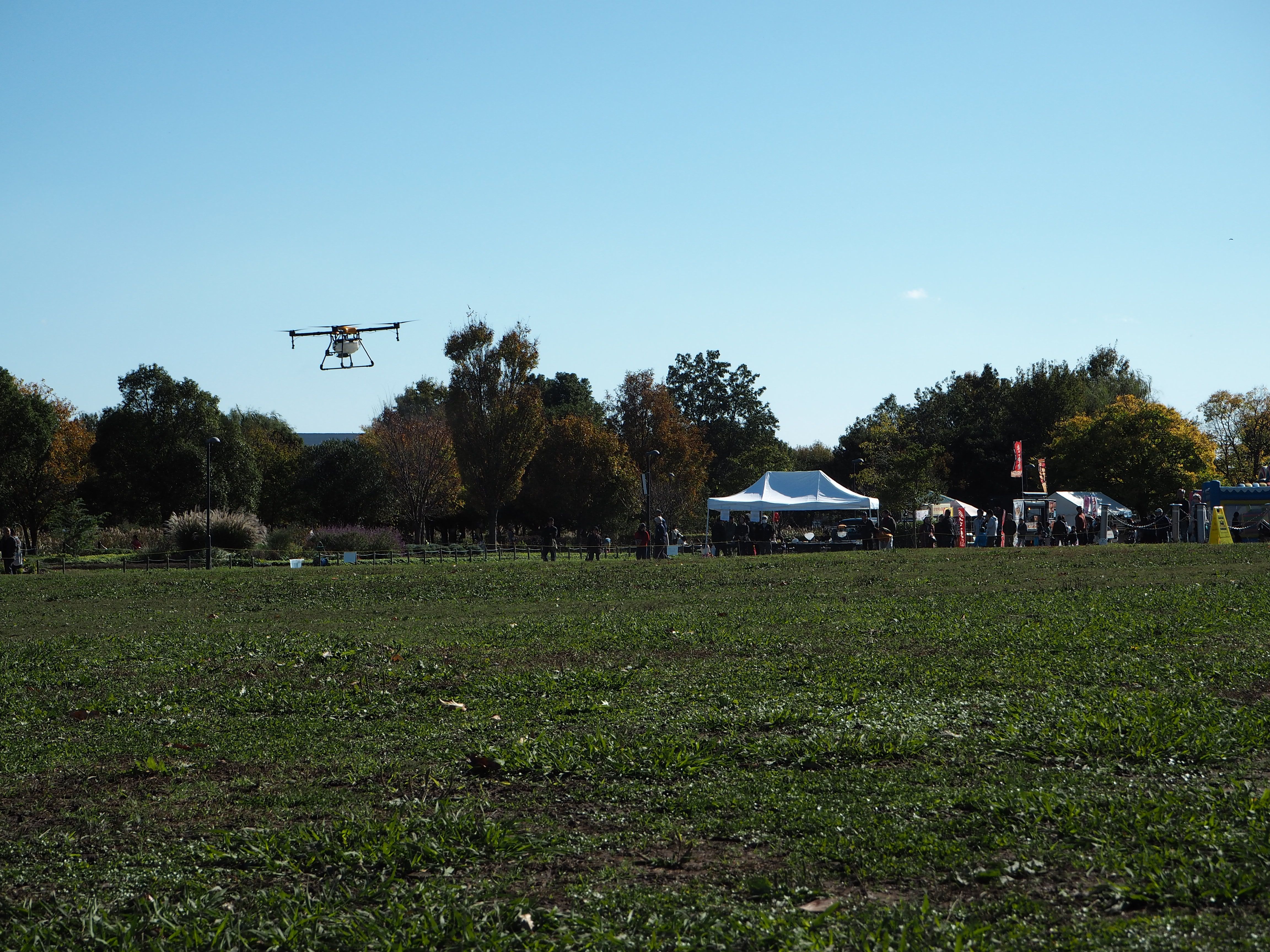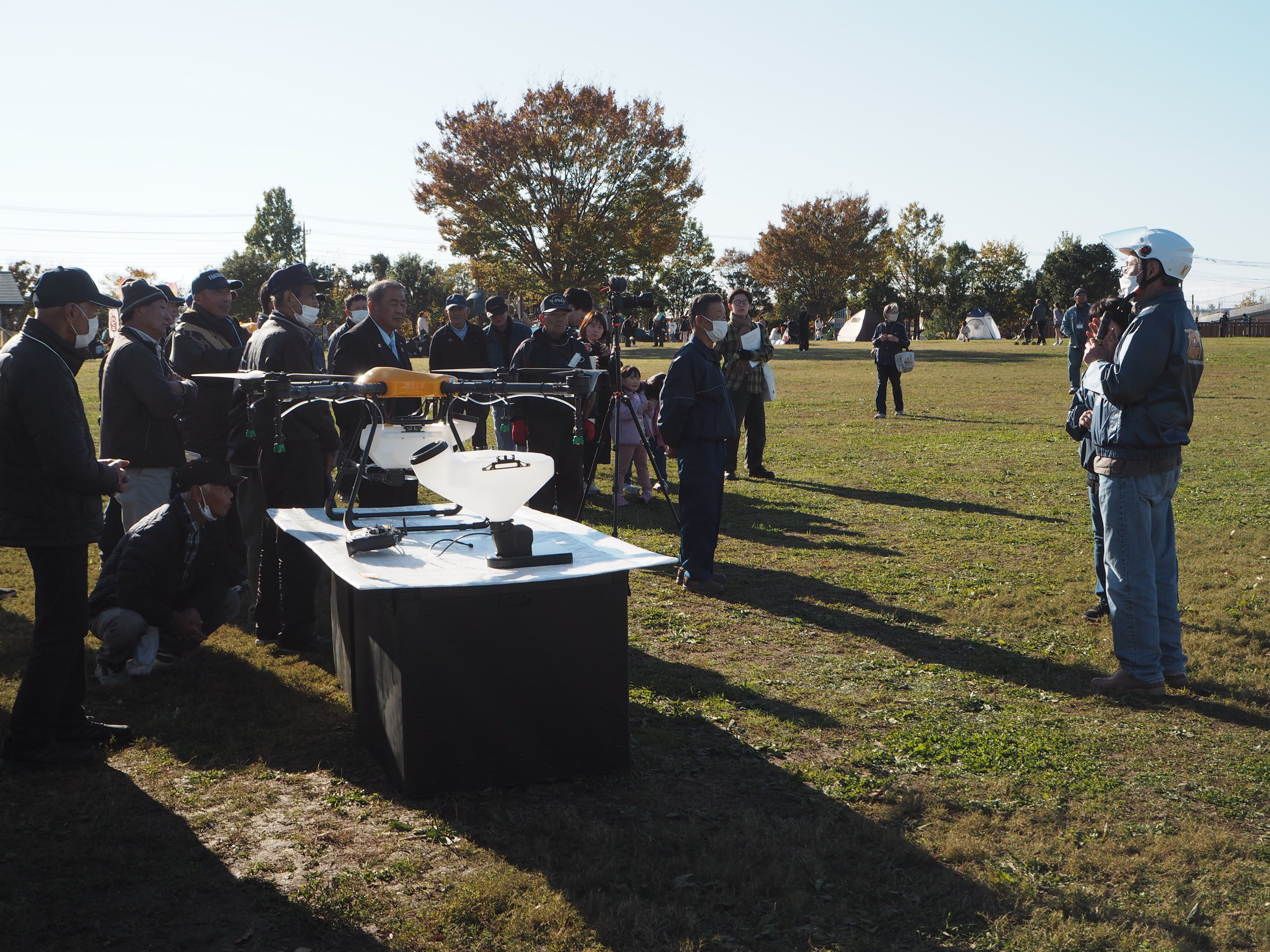 「ドローン事業者による空中散布デモンストレーション」 農業用ドローンによる空中散布は、 イネカメムシの被害防除の有効手段として注目されています |