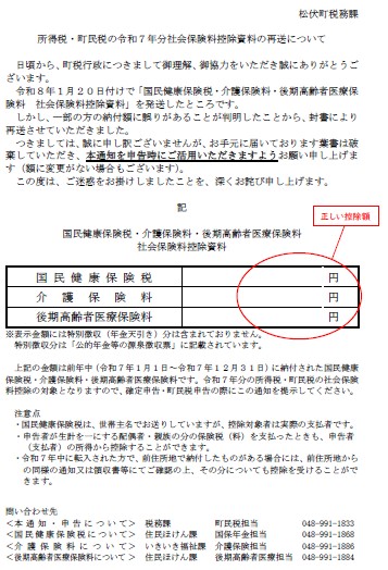 町では行政サービスの一環として、確定申告・町県民税申告で使用する国民健康保険税・介護保険料・後期高齢者医療保険料の社会保険料控除資料を、令和8年1月21日(水)に5,451通発送したところですが、1,452通において納付額(控除額)の誤りが住民からの問い合わせにより判明したことにより、該当者には封書で通知しました。